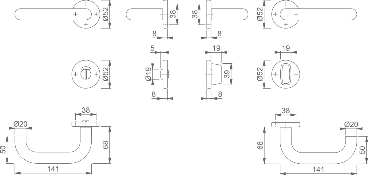Les poignées de ces béquilles ont un diamètre de 20 mm, les rosaces ont un diamètre de 52 mm.