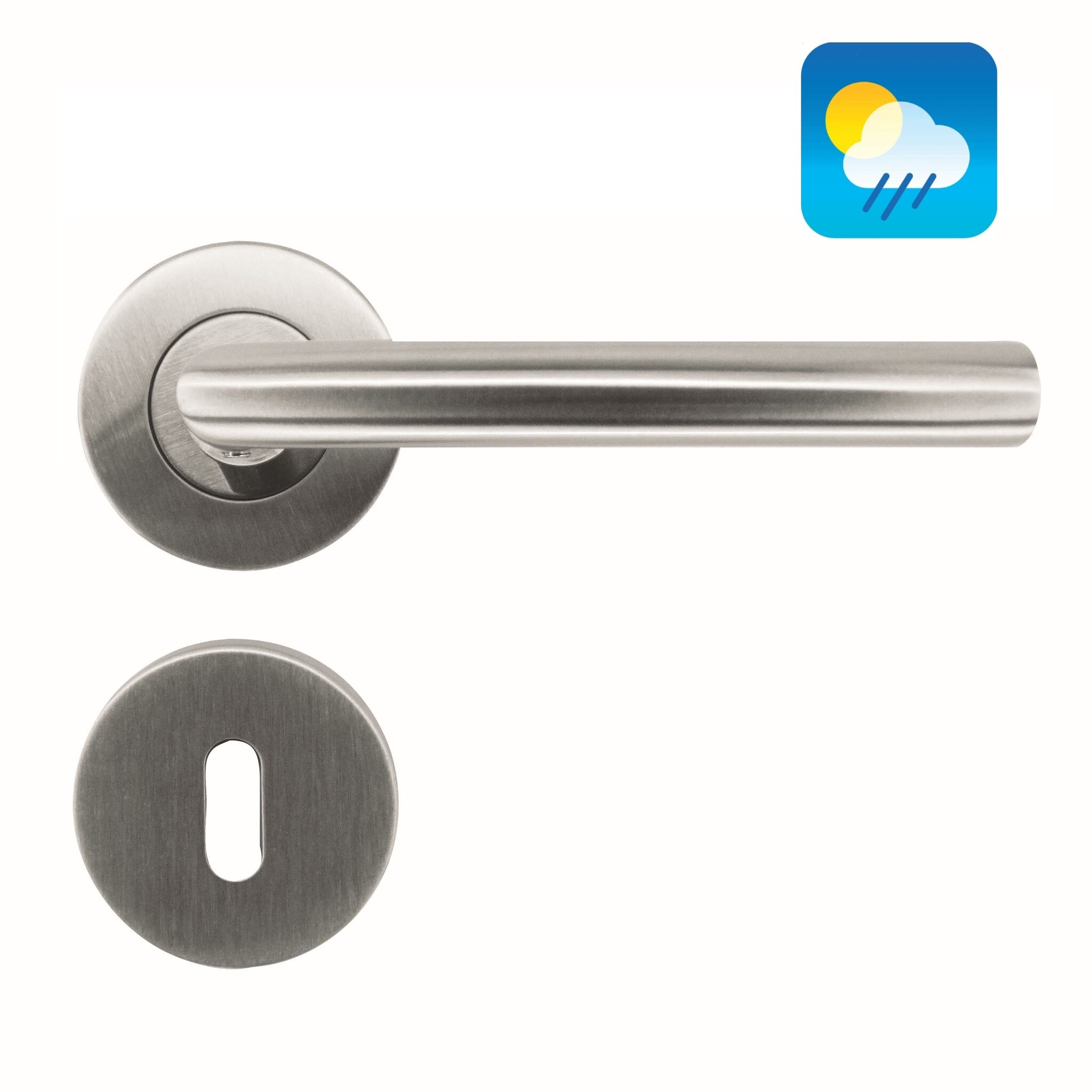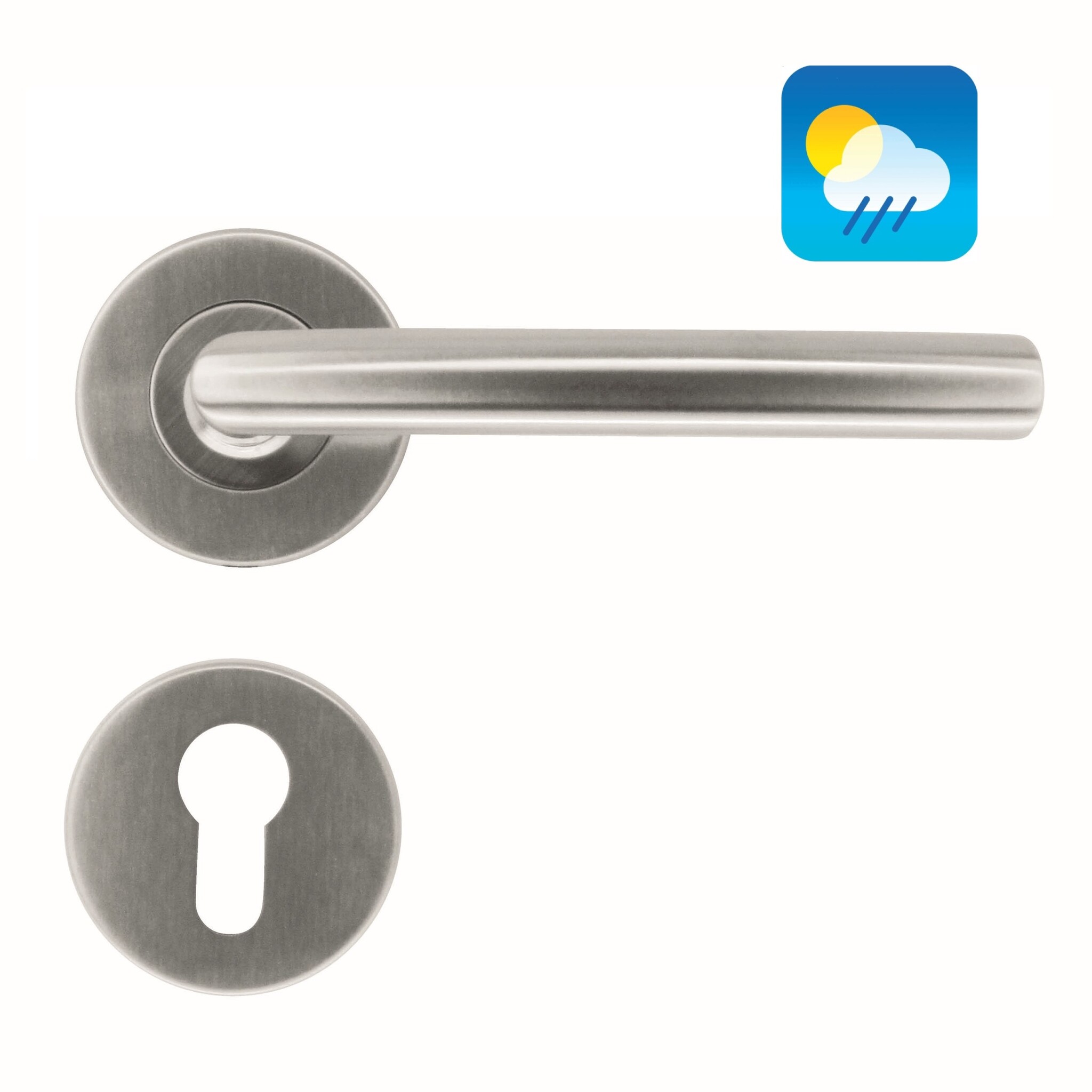 Description Poignées de porte en acier inoxydable "Wals" 16 mm sur rosaces rondes adaptées à une utilisation extérieure et disponibles en 4 versions