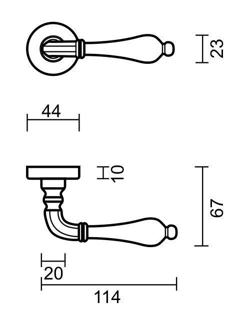 Ces poignées de porte en bronze ont un look classique et sont montées sur des rosaces rondes de 44 mm.