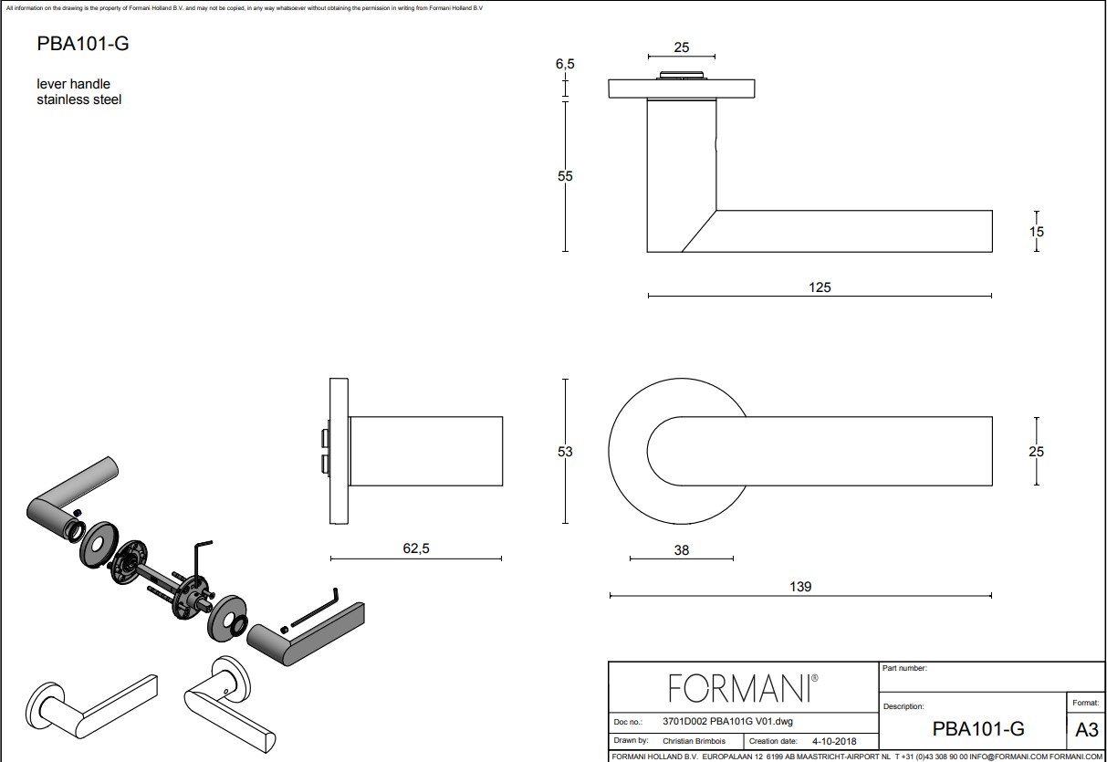 Les poignées de porte ARC PBA101-G sont fournies par paires sans plaques de clé, y compris le matériel de montage et la tige carrée. Ils conviennent aux portes intérieures d'une épaisseur de porte de 38 à 45 mm.