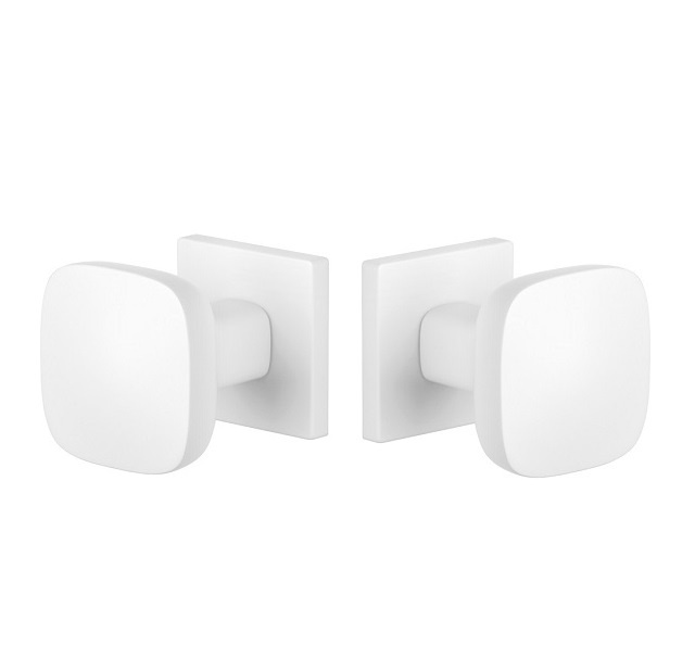 Les poignées de porte blanc mat reposent sur des rosaces carrées de 52x52x7mm et sont équipées de cames qui assurent une fixation ferme. Ils sont fournis par paire comprenant une broche carrée 8x8mm et du matériel de montage pour un montage continu (2x vis M4 brevetées) et des vis.