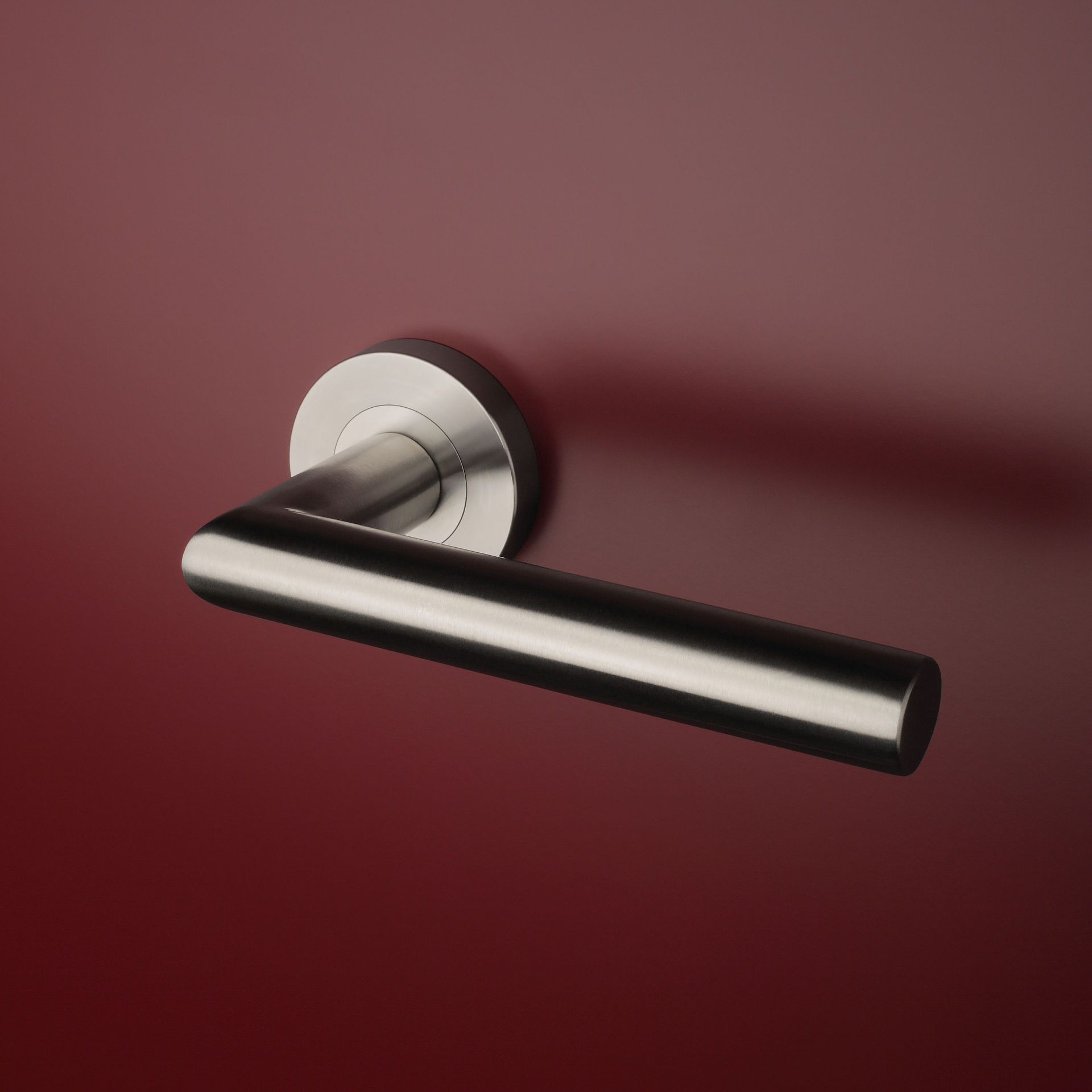 Ces poignées de porte OVAL 1740 en acier inoxydable de STERK sont montées sur des rosaces rondes de 51,5 mm et de 8 mm d'épaisseur. L'avantage de la rosace est qu'elle est vissée sur la rosace de base au lieu d'être clipsée.