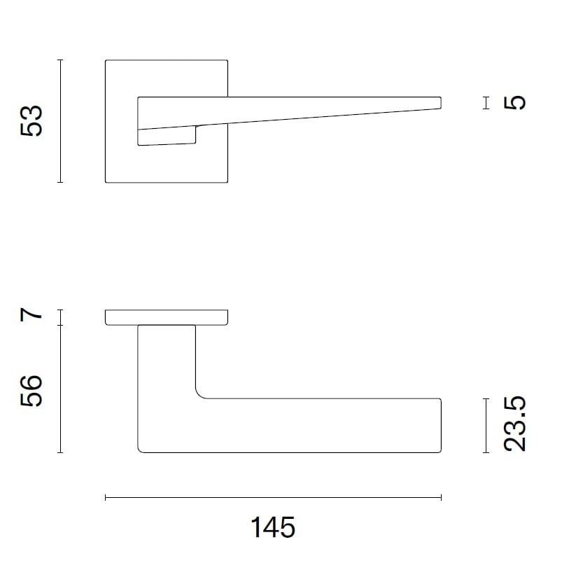 Les poignées de porte chromées mates, équipées de rosaces métalliques à cames, reposent sur des rosaces carrées de 53x53mm et de 7mm d'épaisseur.