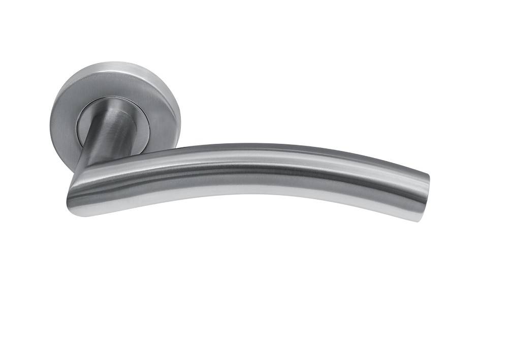 Ces poignées de porte en inox sont montées sur des rosaces rondes d'un diamètre de 53 mm.