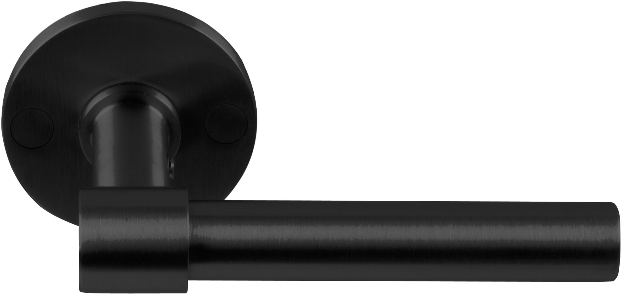 Ces poignées de porte noires sont montées sur des rosaces rondes à ressort d'un diamètre de 50 mm et d'une épaisseur de seulement 5 mm . Les poignées de porte sont également disponibles dans d'autres versions.