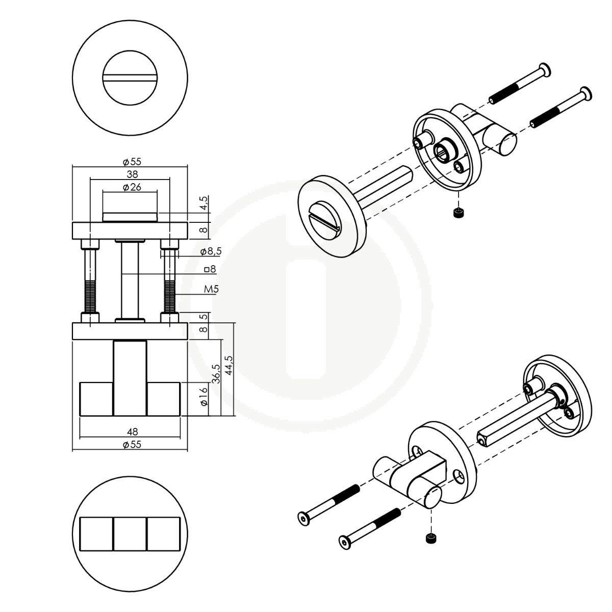 Cet ensemble d'un Ø de 55 mm et d'une épaisseur de 8 mm est recouvert d'un côté, ce qui signifie qu'il n'y a que des trous de vis visibles sur un côté. Avec cet article, le bouton se trouve sur la rosace du trou de vis. Il est également possible d'acheter l'ensemble avec le bouton sur la rosace cachée (voir produits associés).