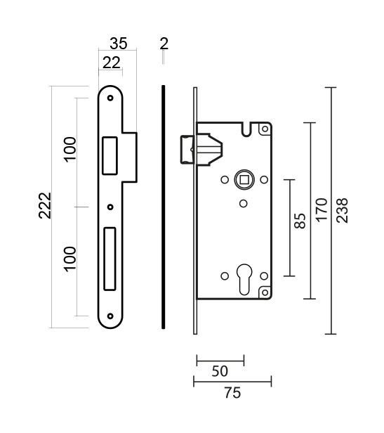 La largeur de la plaque avant arrondie est de 22 mm et la hauteur est de 238 mm.