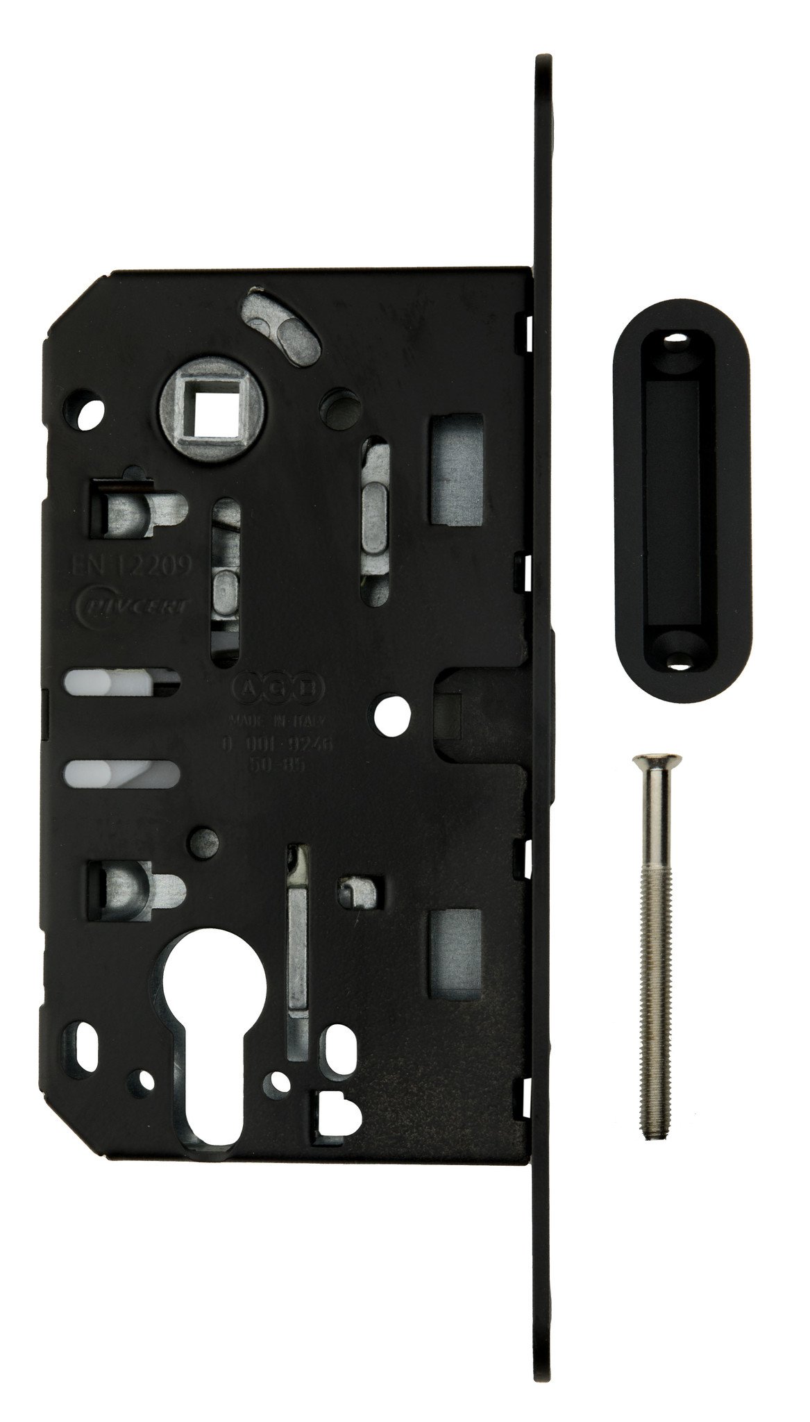 Serrure magnétique noire avec une taille d'axe de 85 mm et un mandrin de 50 mm. La plaque avant est de 22x195mm.