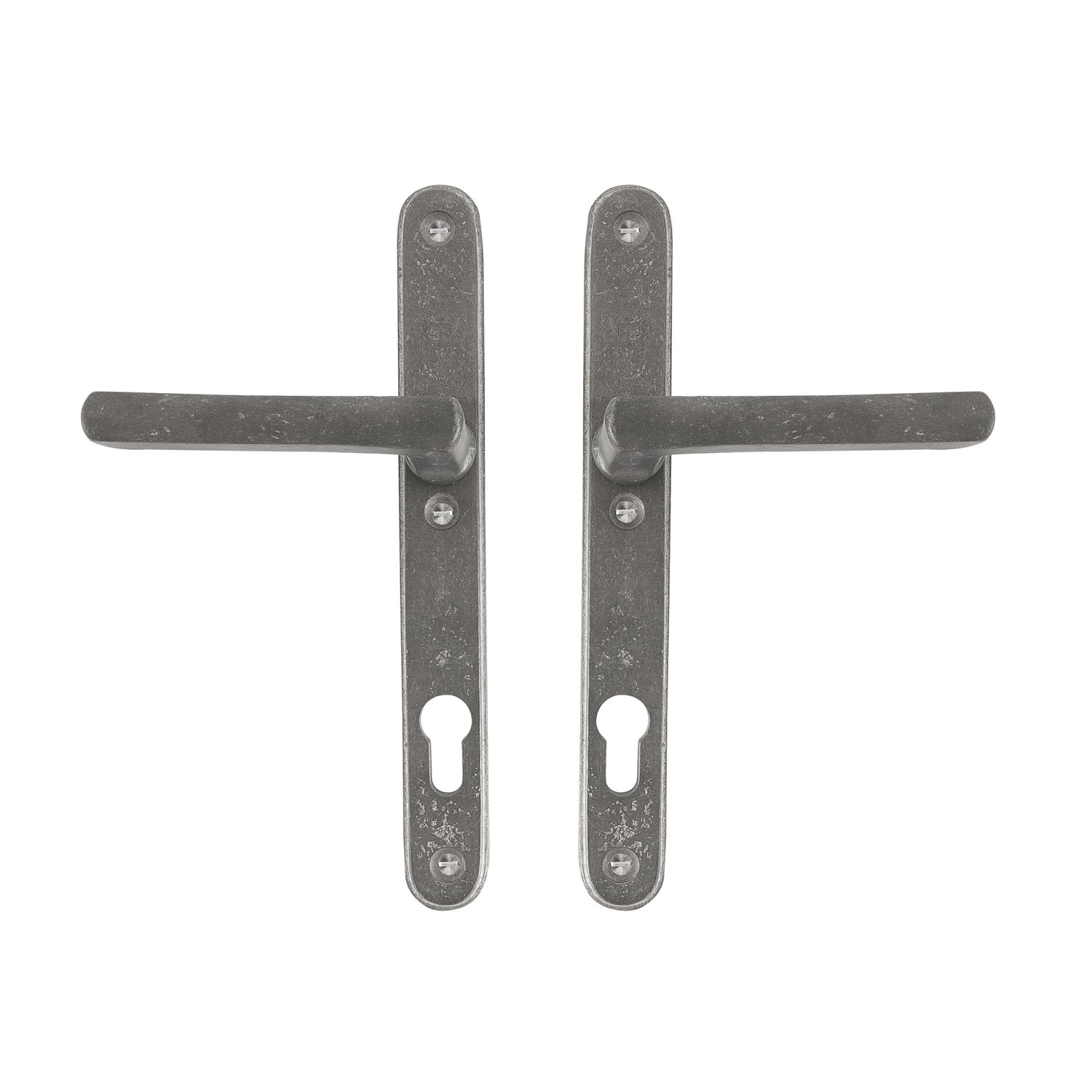 Ferrure de sécurité à bouclier étroit en métal brut qui est équipée de 2x une poignée de porte PH1920 avec une taille d'axe PZ de 72, 92 ou 110mm