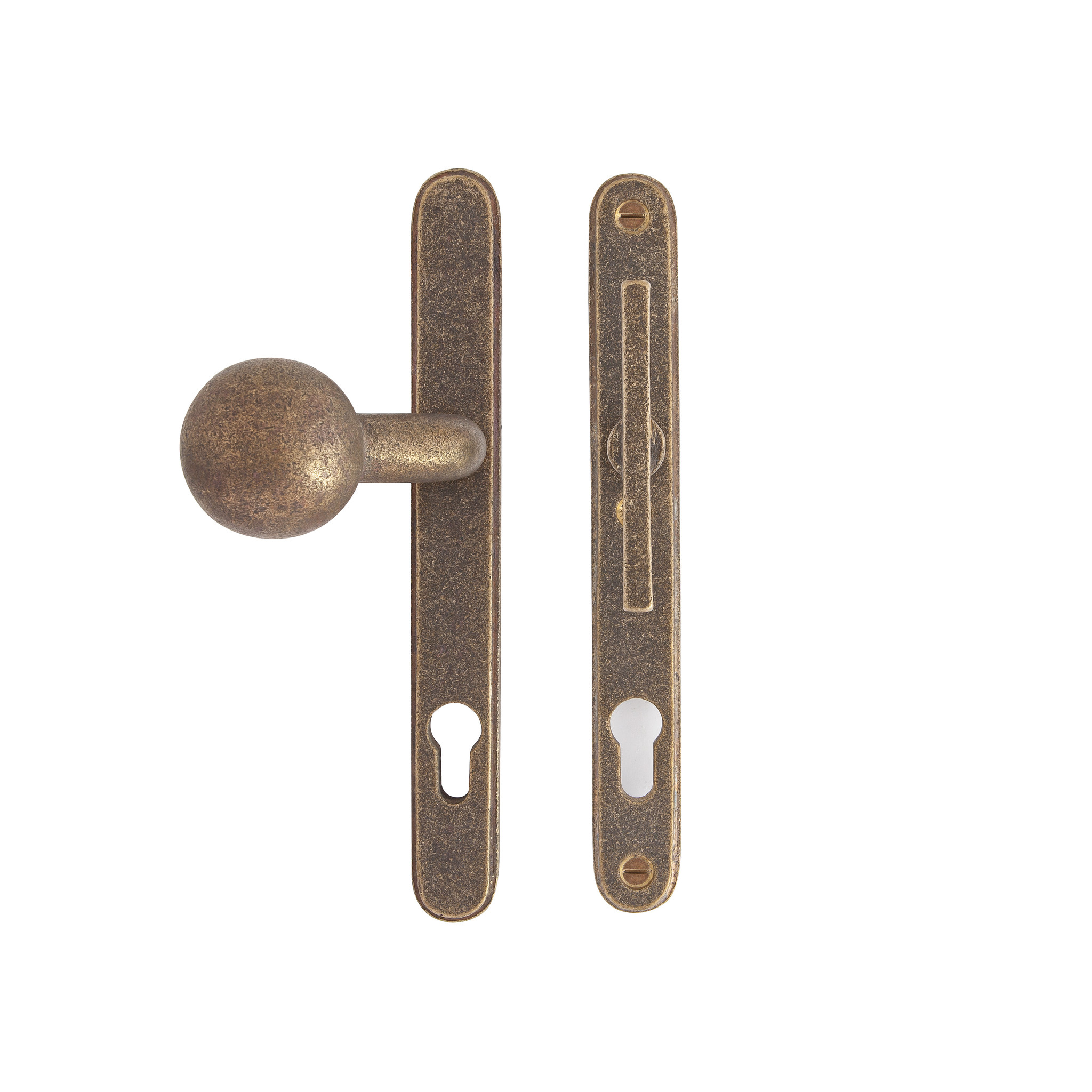 Ensemble de sécurité à bouclier étroit en bronze brut composé d'un bouton fixe et d'une poignée de porte en forme de T PH2017"T". Tailles d'axe PZ possibles de 72, 92 ou 110 mm