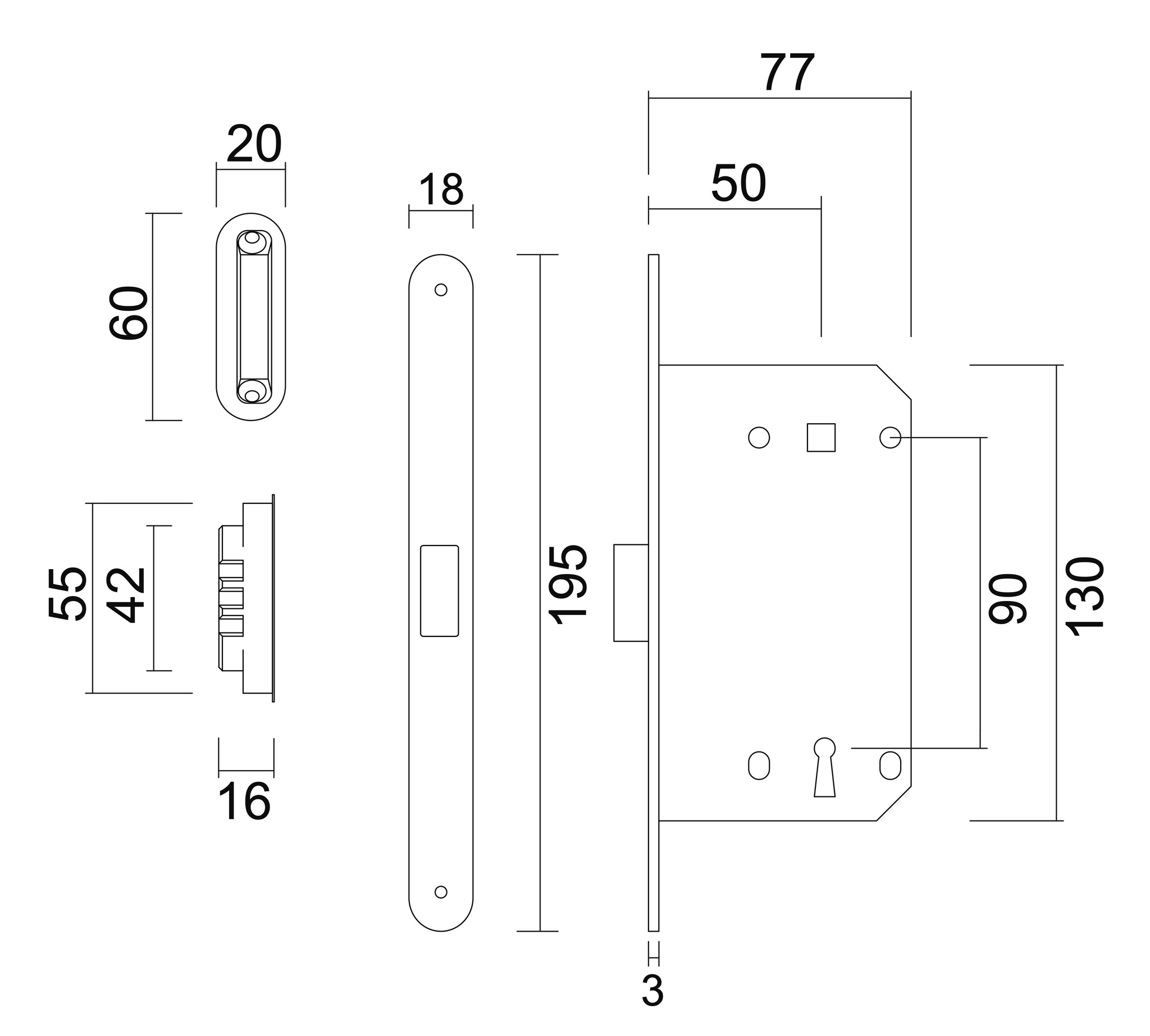 Serrure magnétique 195x18mm avec trou de serrure 90mm aspect inox