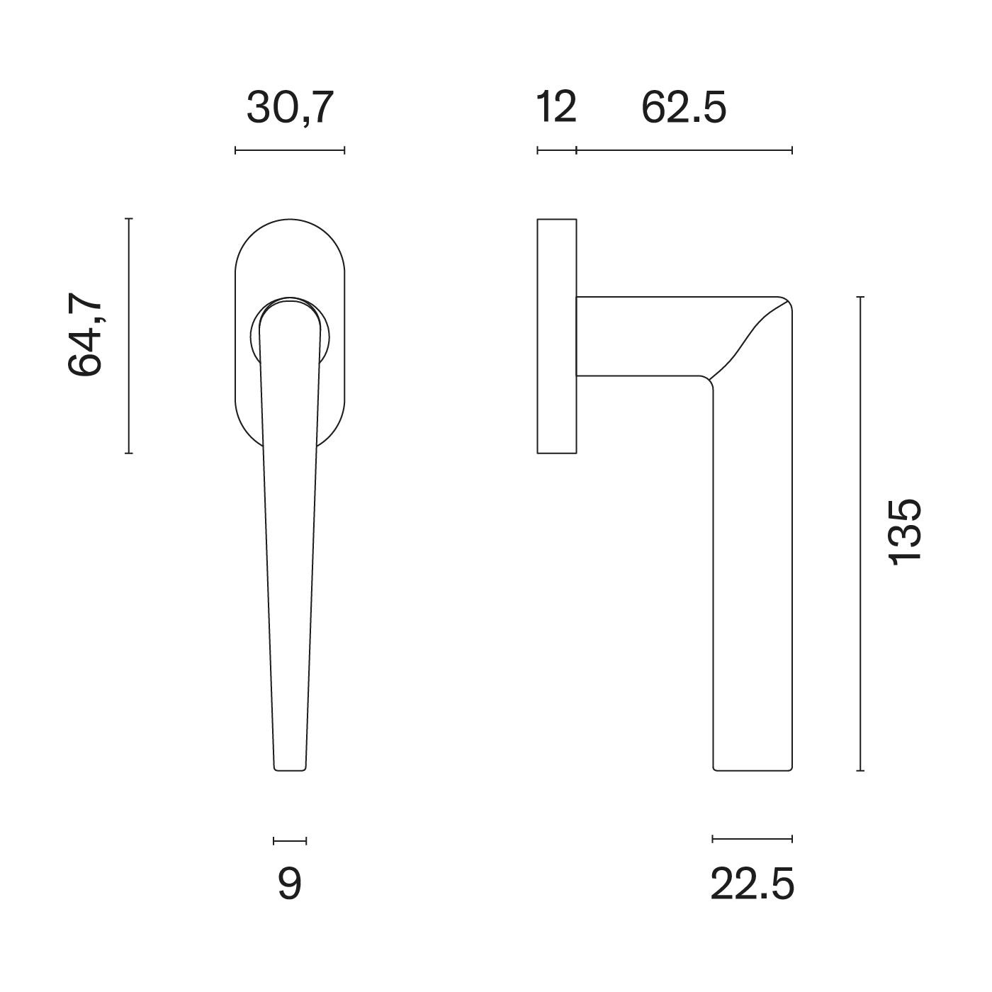 Le manche de 22,5x9 mm repose sur une rosace ovale de 64,7x30,7x12 mm.