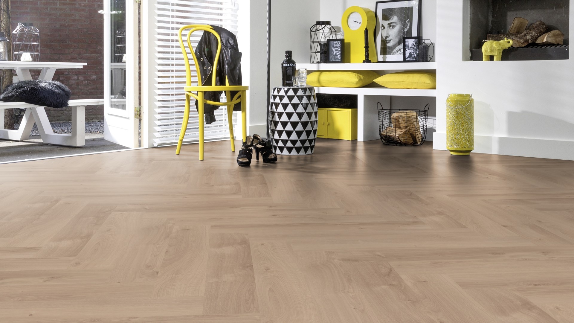 La structure en relief donne un aspect naturel et grâce à la rainure en V tout autour, le motif à chevrons est magnifiquement mis en valeur. Les pièces ont une taille de 85,8 cm x 14,3 cm et sont reliées par une connexion à clic HDF.