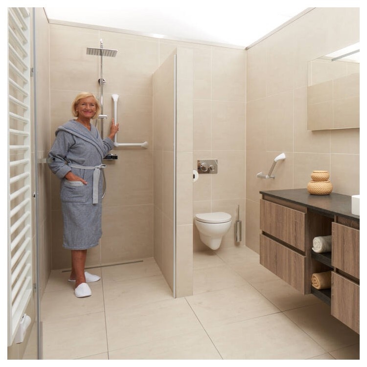Fabriquée en aluminium anodisé avec un revêtement blanc durable, cette barre d'appui murale offre un support robuste dans les deux sens. Son angle de 90° la rend idéale pour une utilisation près des toilettes, sous la douche ou près de la baignoire, où une adhérence et une stabilité accrues sont nécessaires.