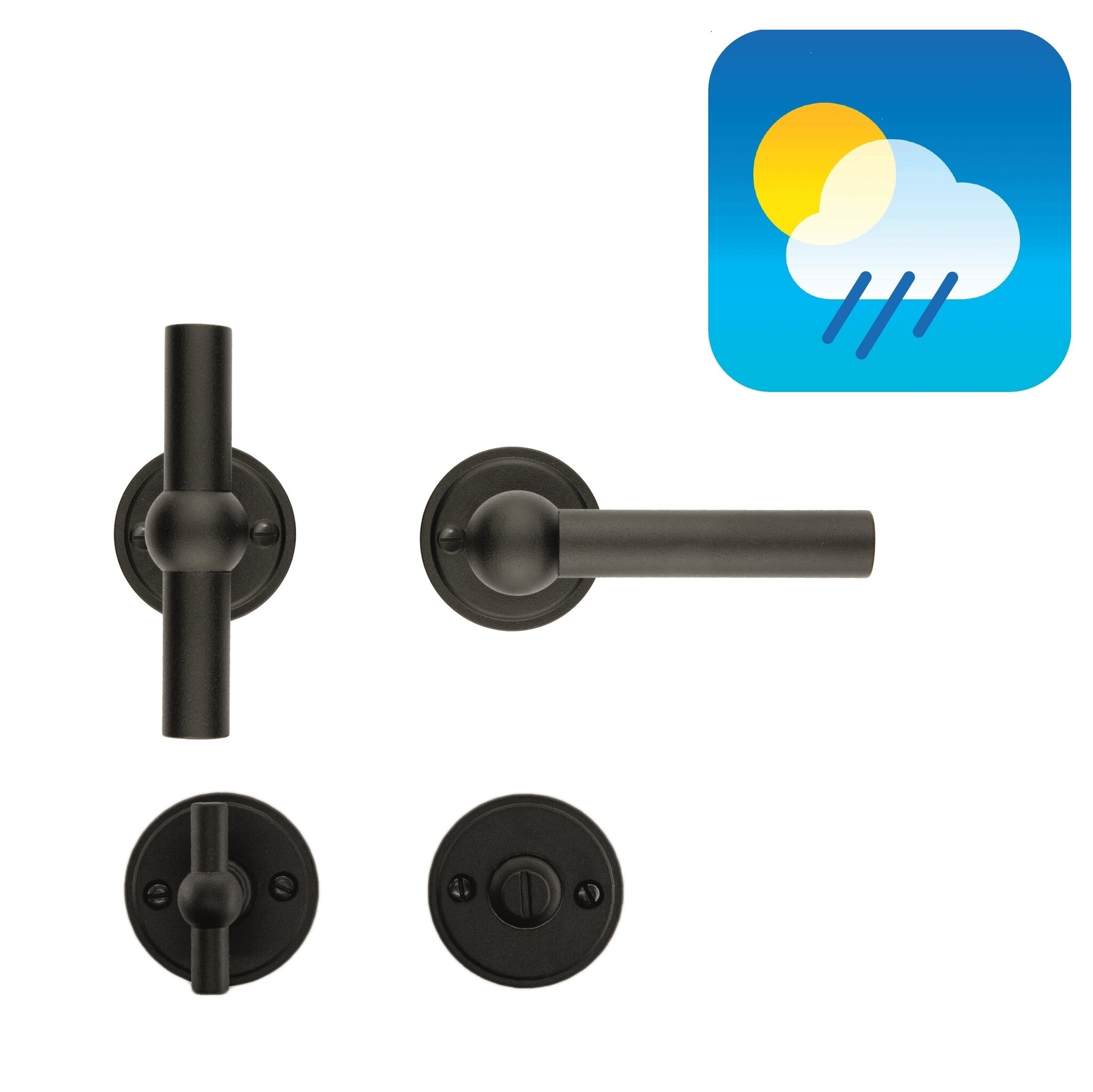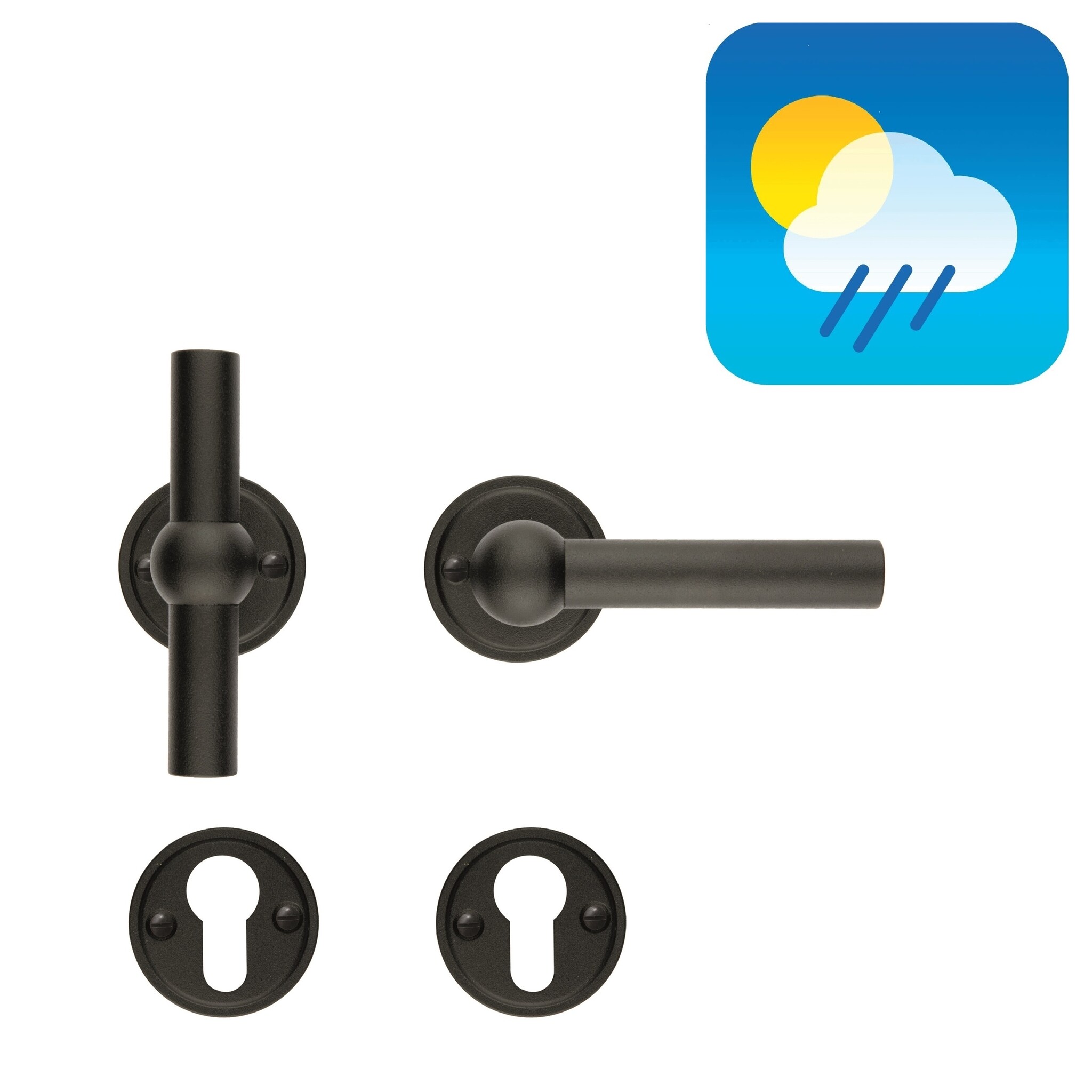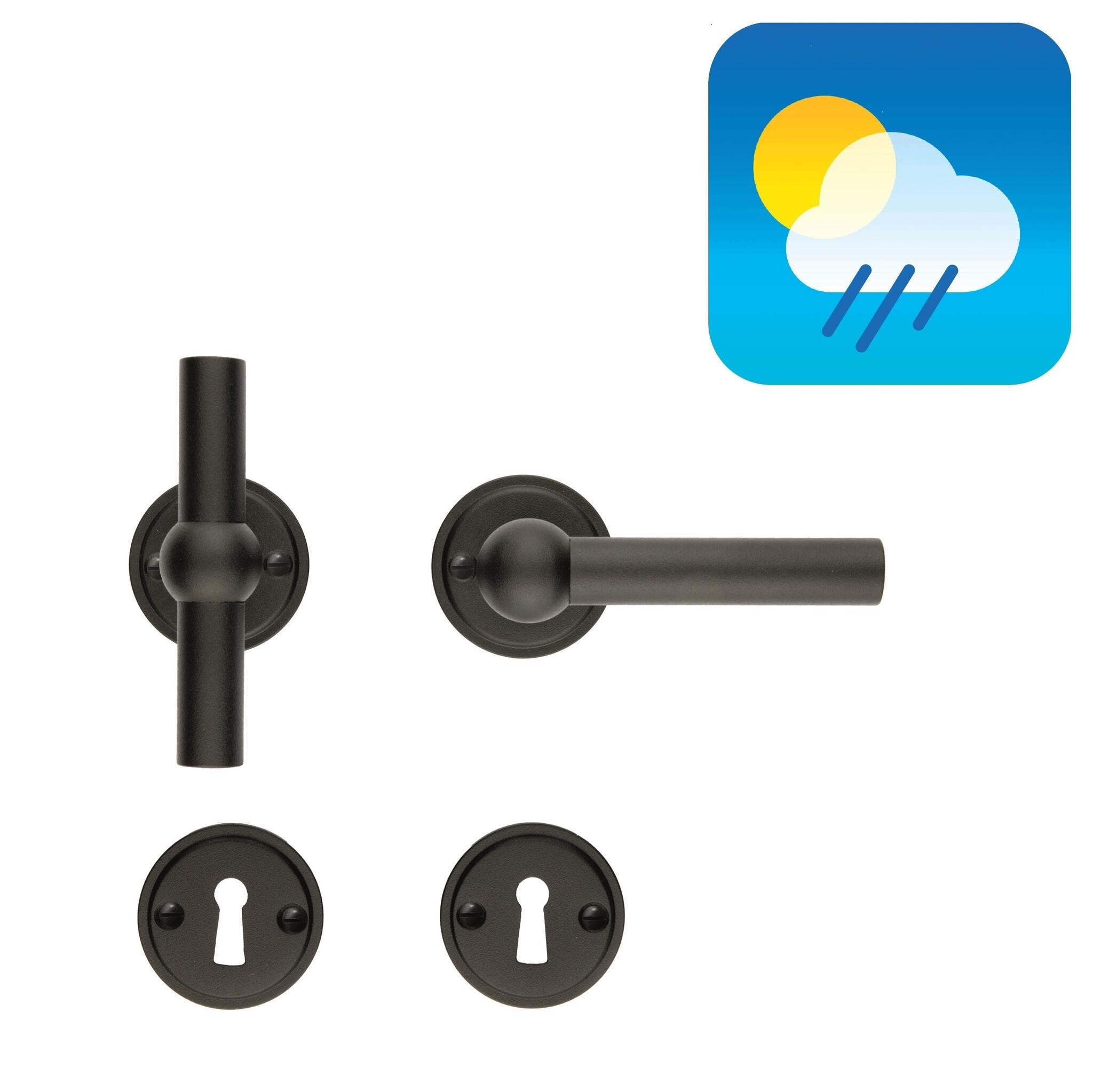 Ces poignées de porte noires T+L reposent sur de fines rosaces rondes. Elles sont fabriquées en laiton et finies avec un revêtement structuré noir mat (Ral 9005) résistant aux UV, ce qui rend ces poignées de porte également adaptées à une utilisation en extérieur .