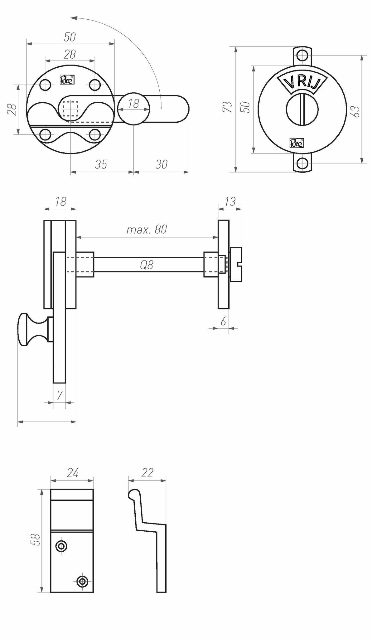 La ferrure des toilettes comporte une plaque rectangulaire avec laquelle vous pouvez fermer la porte sur le cadre de la porte (voir image ci-jointe). Cet ensemble est fourni sous forme d'ensemble complet comprenant le matériel de montage et une tige carrée 6x6 mm avec des manchons d'adaptation pour des ouvertures de 7 et 8 mm.