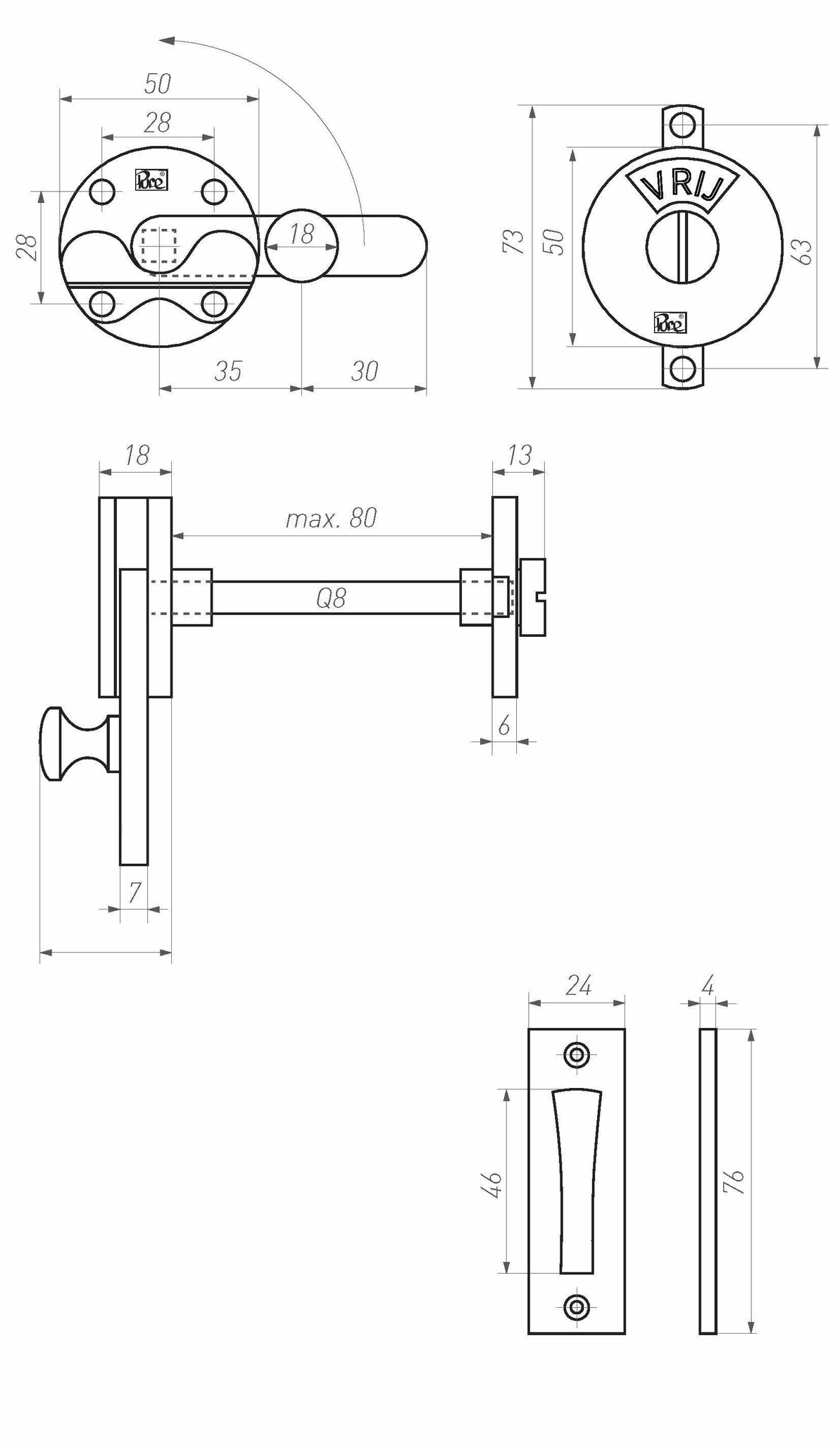 La ferrure des toilettes comporte une plaque rectangulaire avec laquelle vous pouvez fermer la porte dans le cadre de la porte. Cet ensemble est fourni sous forme d'ensemble complet comprenant le matériel de montage et une tige carrée 6x6 mm avec des manchons d'adaptation pour des ouvertures de 7 et 8 mm.