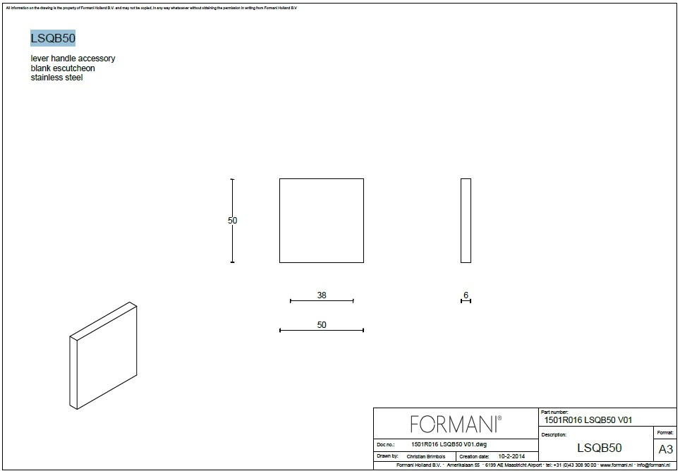 Dit vierkant blind plaatje is 50x50mm en heeft een dikte van 6mm.