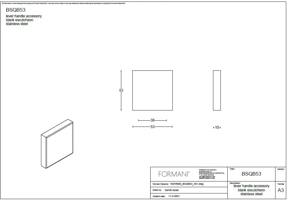 Beschrijving 1 x vierkant plaatje Basics BSQB53 blind 10 mm dik in PVD gunmetal
