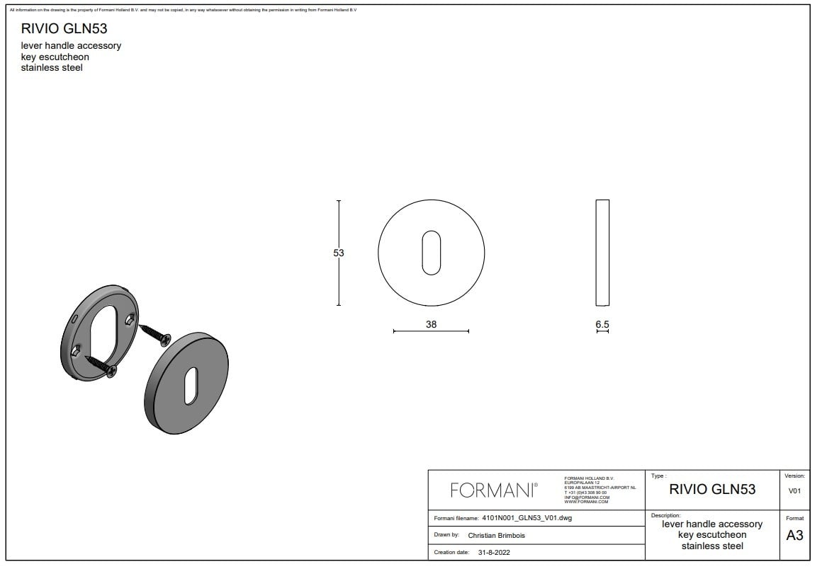 Het sleutelplaatje behoort tot de "RIVIO" serie van Formani en is vervaardigt uit RVS. Als eindbewerking wordt dit plaatje afgewerkt met een sterke licht bronzen PVD Coating.