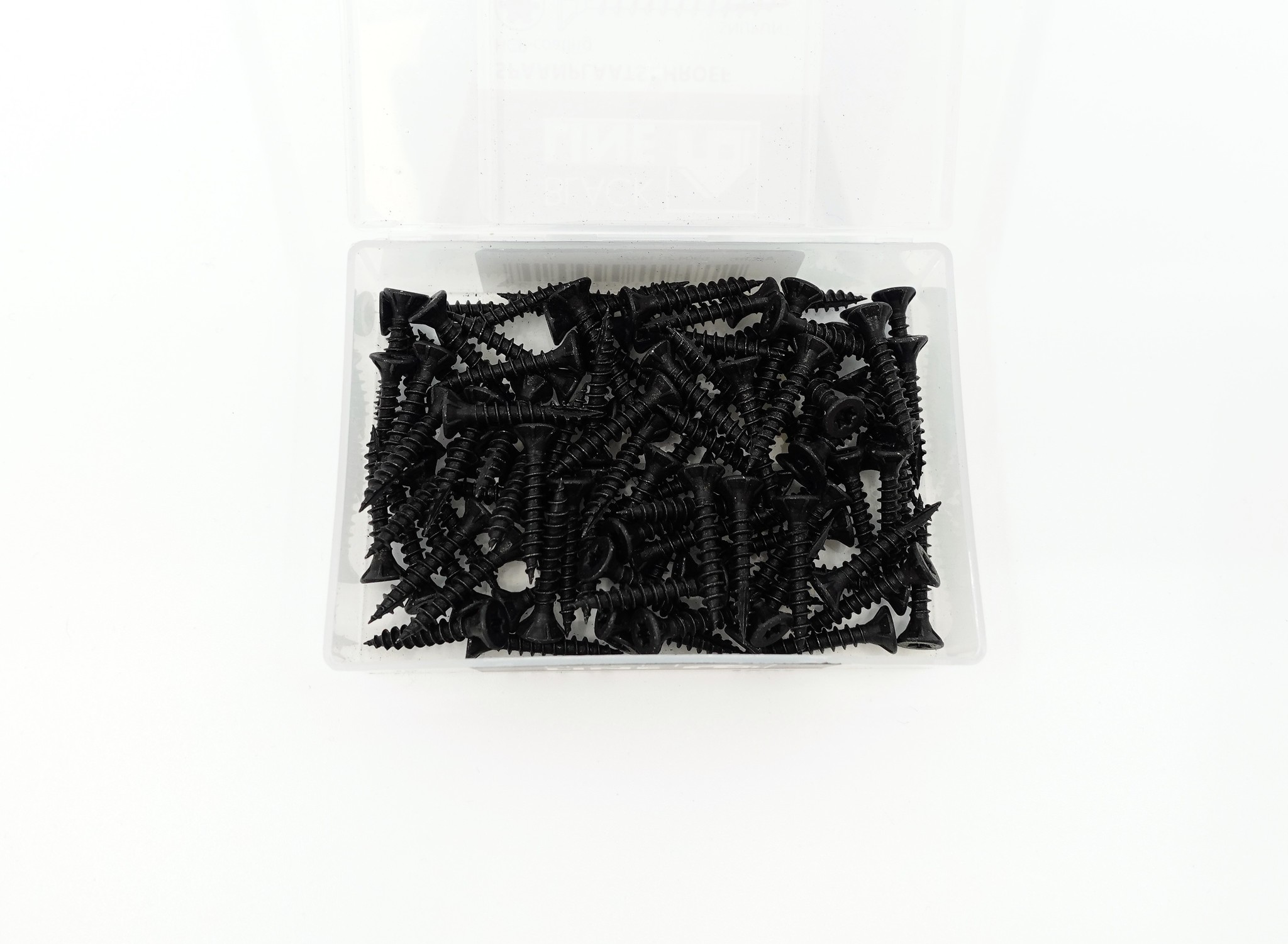 Doosje van 100 zwarte Torx schroeven. Ze zijn 4mm dik en hebben een lengte van 40 mm Torx T-20. De kop heeft een mat zwarte afwerking en heeft een Ø van 8mm.