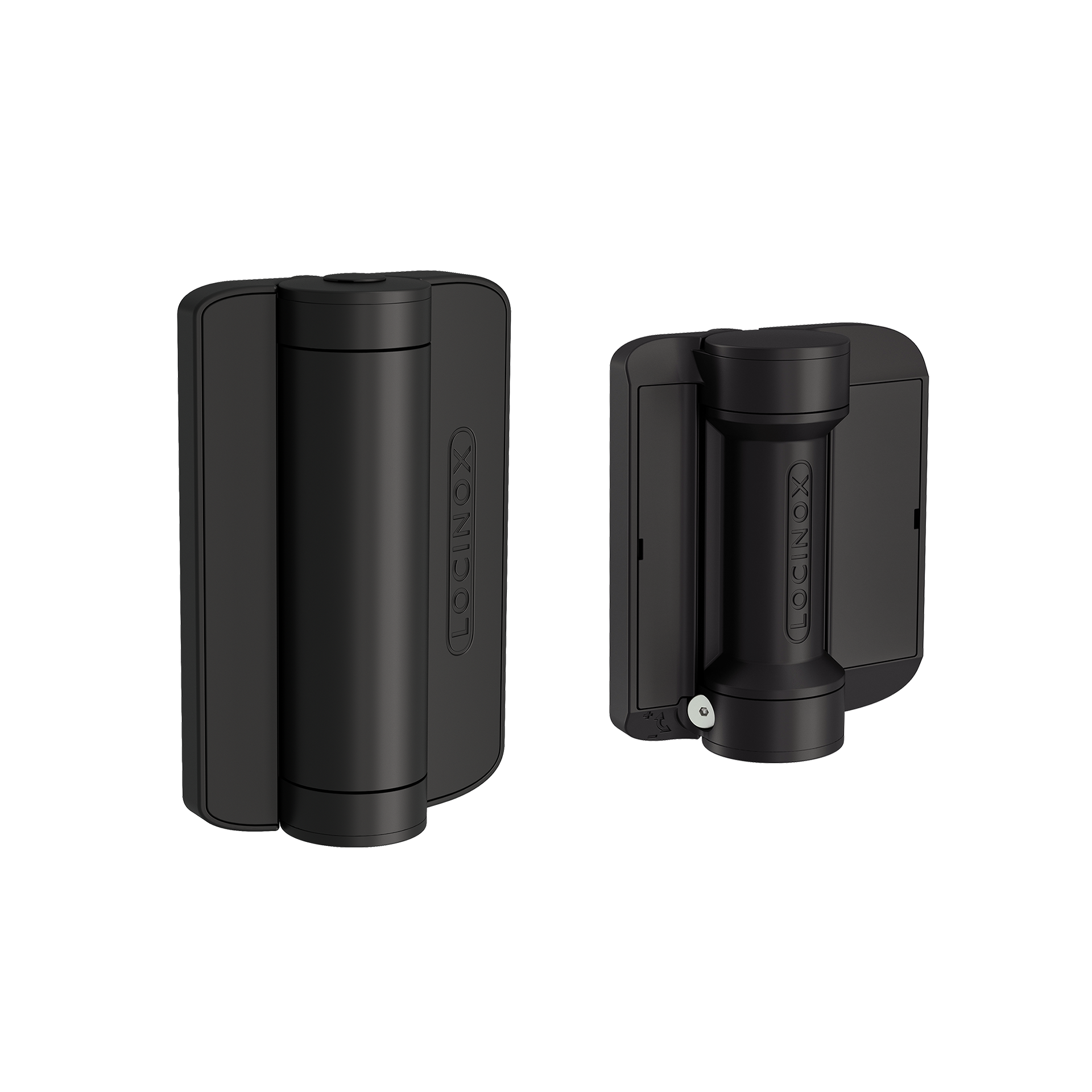 Beschrijving Zwarte Locinox hydraulisch 180° poortsluiter CARACAL-SD-K met regelbare sluitsnelheid gecombineerd met SERVAL scharnier voor vierkante of ronde palen