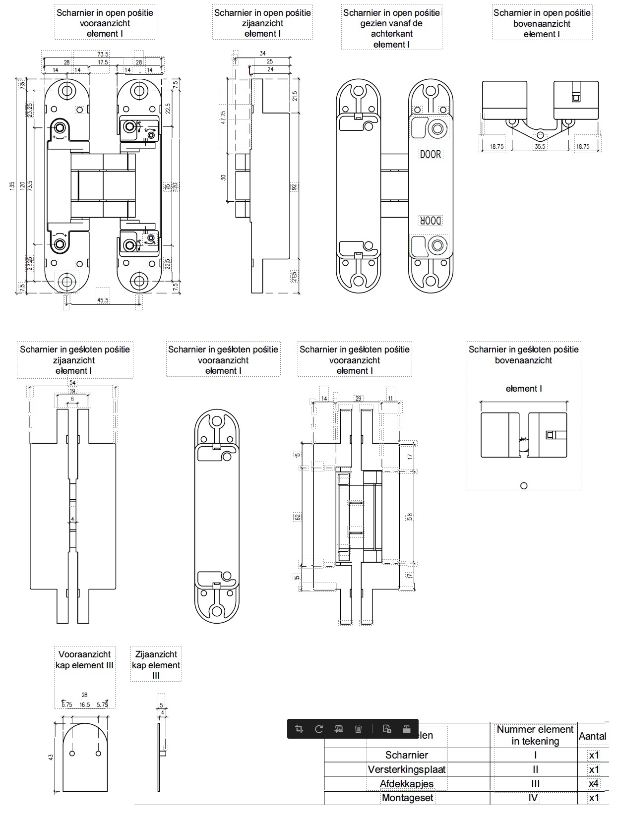 De 3D scharnieren worden geleverd met 4 plastic afdekkapjes in mat zwarte afwerking en 4 schroeven (5x30mm).