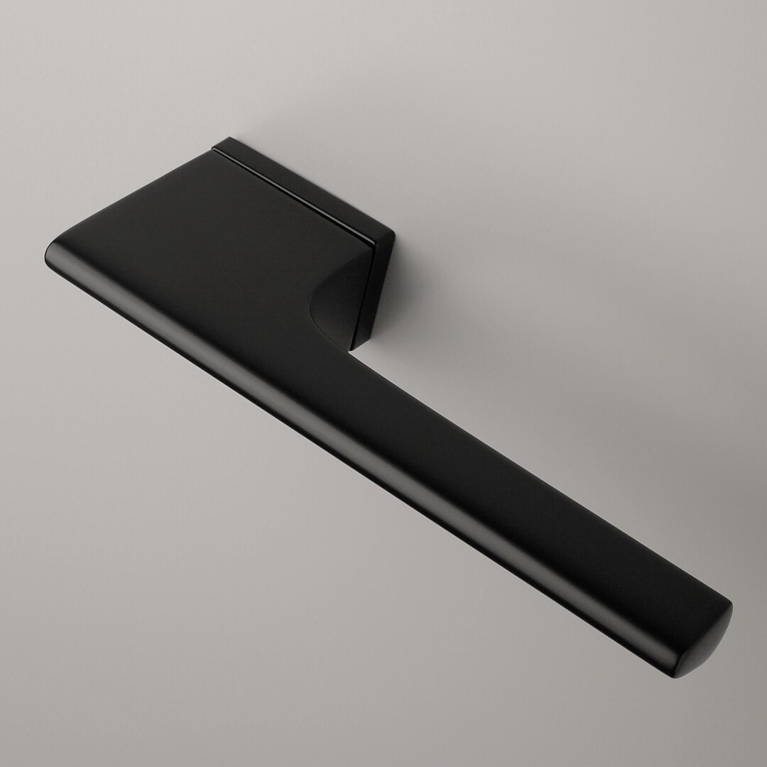Deze zwarte massieve deurklinken hebben een futuristische vorm en zijn bedoeld voor interieurs van Designliefhebbers.
