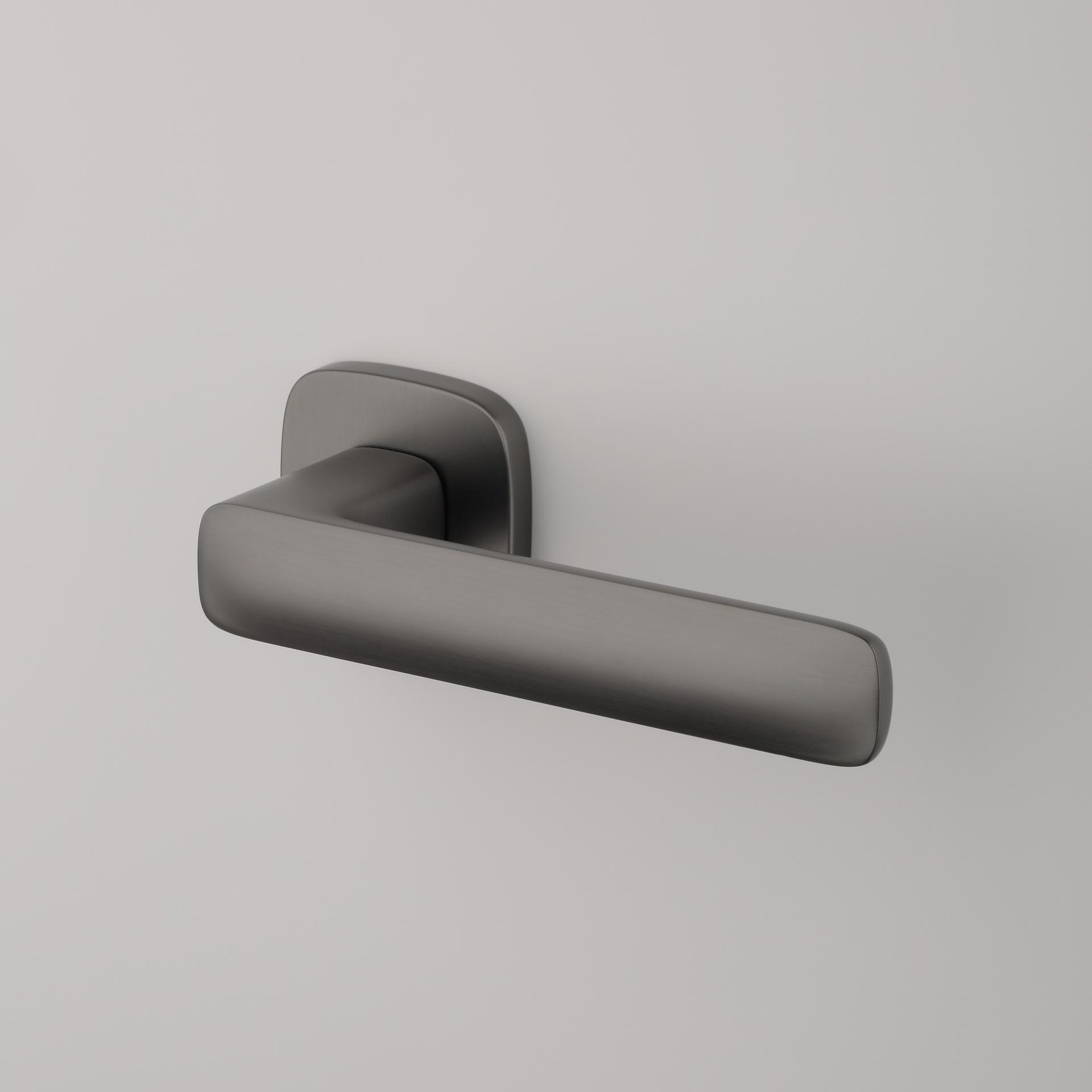 Beschrijving Massieve deurklinken Stella in grafiet grijs op vierkant rozetten met mooie afgeronde hoeken 52x52x7mm van APRILE