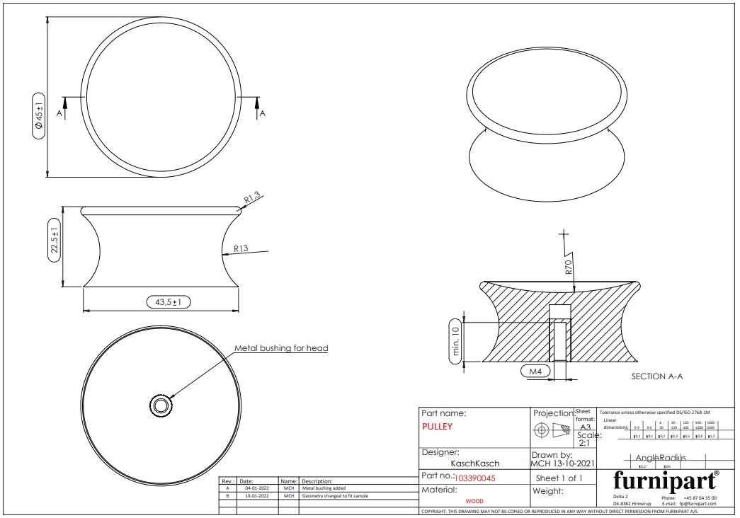 Beschrijving Eikenhouten Furnipart meubelknop PULLEY met een Ø van 45 mm en een hoogte van 22 mm uitgevoerd in het bruin