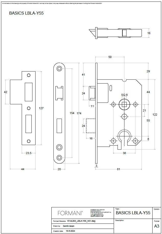 Beschrijving FORMANI Cilinderslot LBLA-Y55 met afgeronde voorplaat 174 x 20mm uitgevoerd in het Brons geleverd zonder cilinder