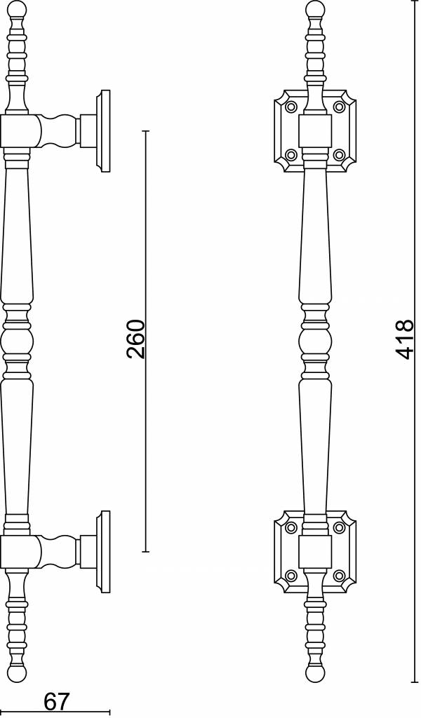 Ijzersterke Titanium deurgreep met een klassiek karakter. De massieve deurgreep heeft een totale lengte van 418 mm en de hart-op-hart maat is 260 mm.