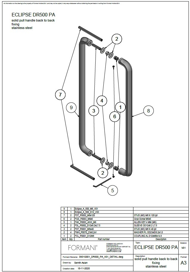 De deurgreep is in totaal 523 mm lang en ze komt 55 mm naar voor. De asafstand is 500 mm.