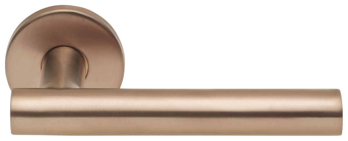 Beschrijving Geveerde deurklinken GIADA op een rond rozet uitgevoerd in PVD licht brons. Mooi design tegen een scherpe prijs