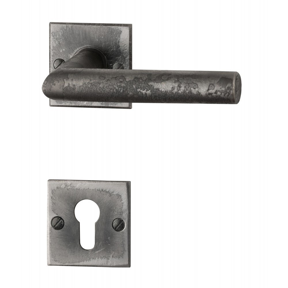 Karaktervolle deurklinken op een strak, vierkant rozet uitgevoerd in ruw staal.
