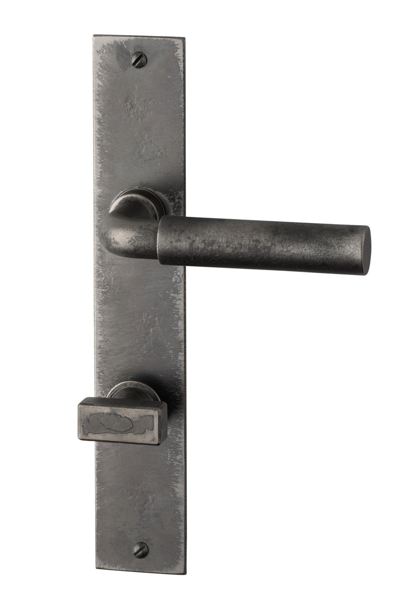 Deurklinken met Karakteristieke uitstraling op een strak, rechthoekig schild uitgevoerd in ruw staal.
