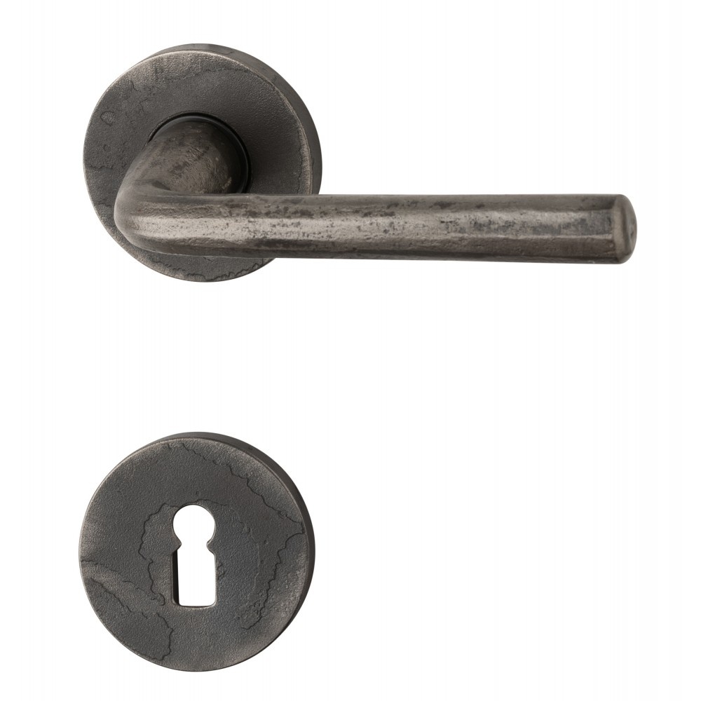 Exclusieve deurklinken op ronde verdekte rozetten in ruw staal.