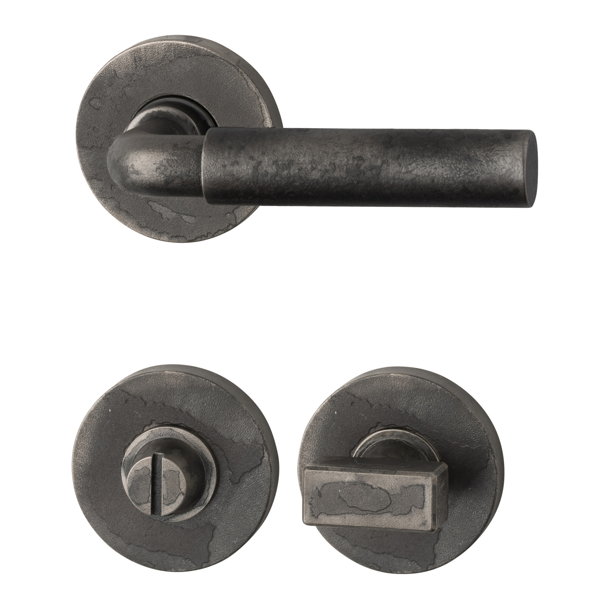 Deurklinken met karakter op een mooi rond rozet uitgevoerd in ruw staal.