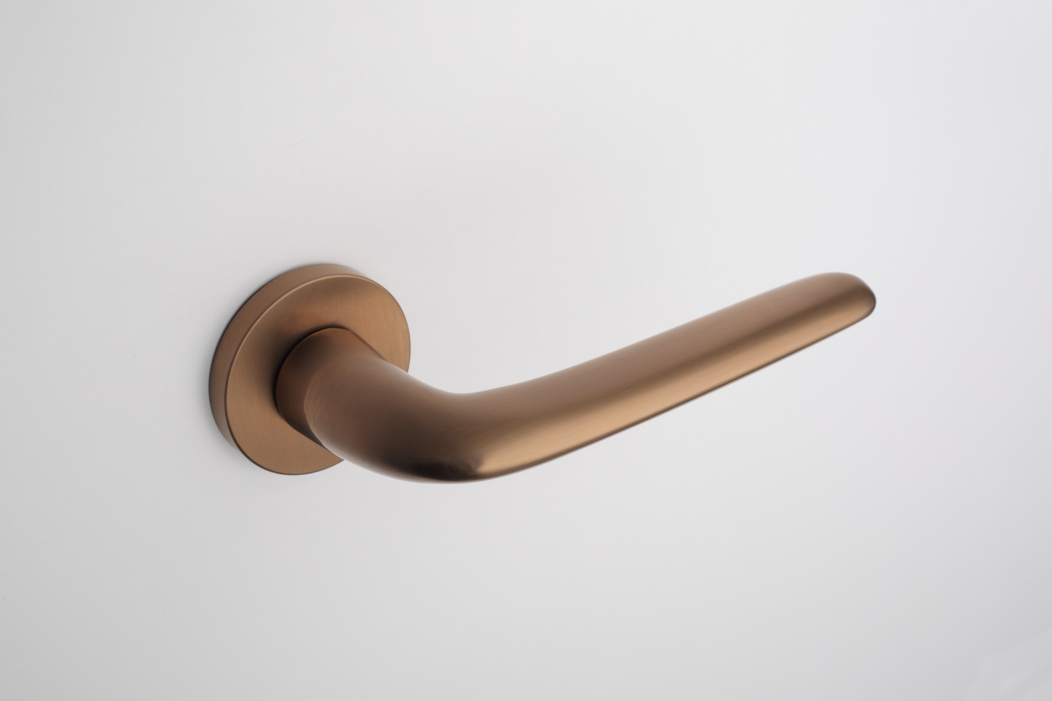 Beschrijving Massieve deurklinken Azalia in mat koper op ronde rozetten Ø52x7 mm van Aprile