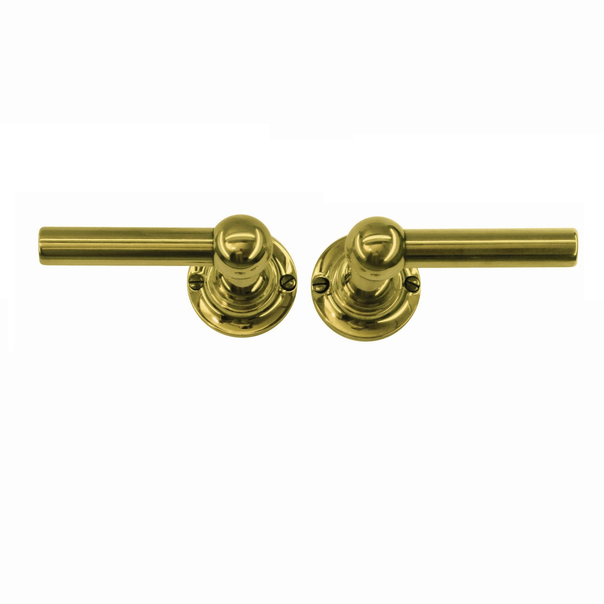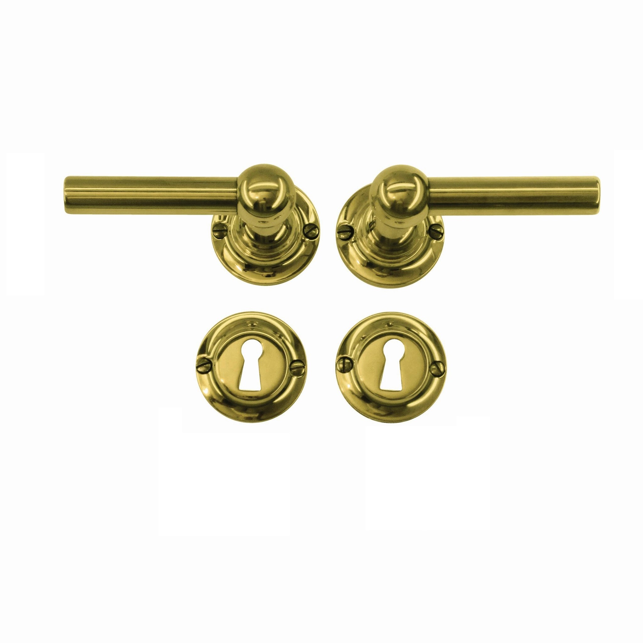 Beschrijving Landelijke deurklinken in een glanzend gouden kleur op ronde rozetten leverbaar in 4 varianten