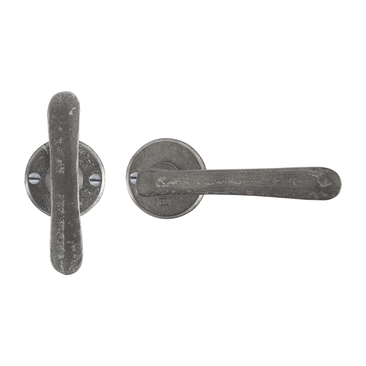 Beschrijving Tijdloze deurklinken PHTL ”T+L” ruw metaal zonder sleutelplaatjes op een rond rozet van Ø 50mm