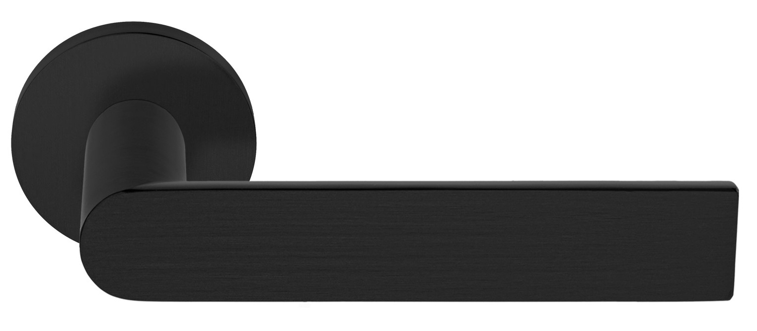 Beschrijving Deurklinken ARC PBA101-G zonder sleutelplaatjes op ronde rozetten in mat zwart ontworpen door de bekende ontwerper Piet Boon met PVD coating