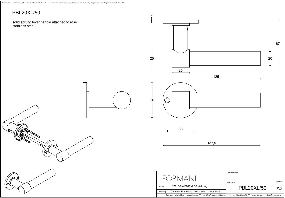 Deze PBL20XL/50 deurklinken worden per paar geleverd, compleet met bevestigingsmaterialen en een vierkantstift, geschikt voor binnendeuren met een dikte van 38-45 mm.