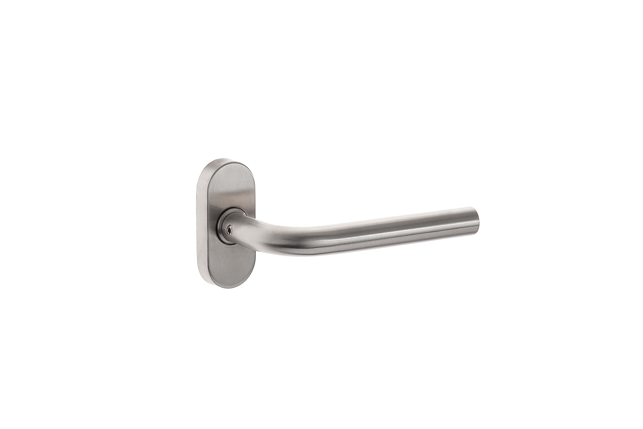 Beschrijving ASSA ABLOY deurklinken uit de TONIC-LINE op ovale rozetten geschikt voor intensief gebruik in geborsteld RVS