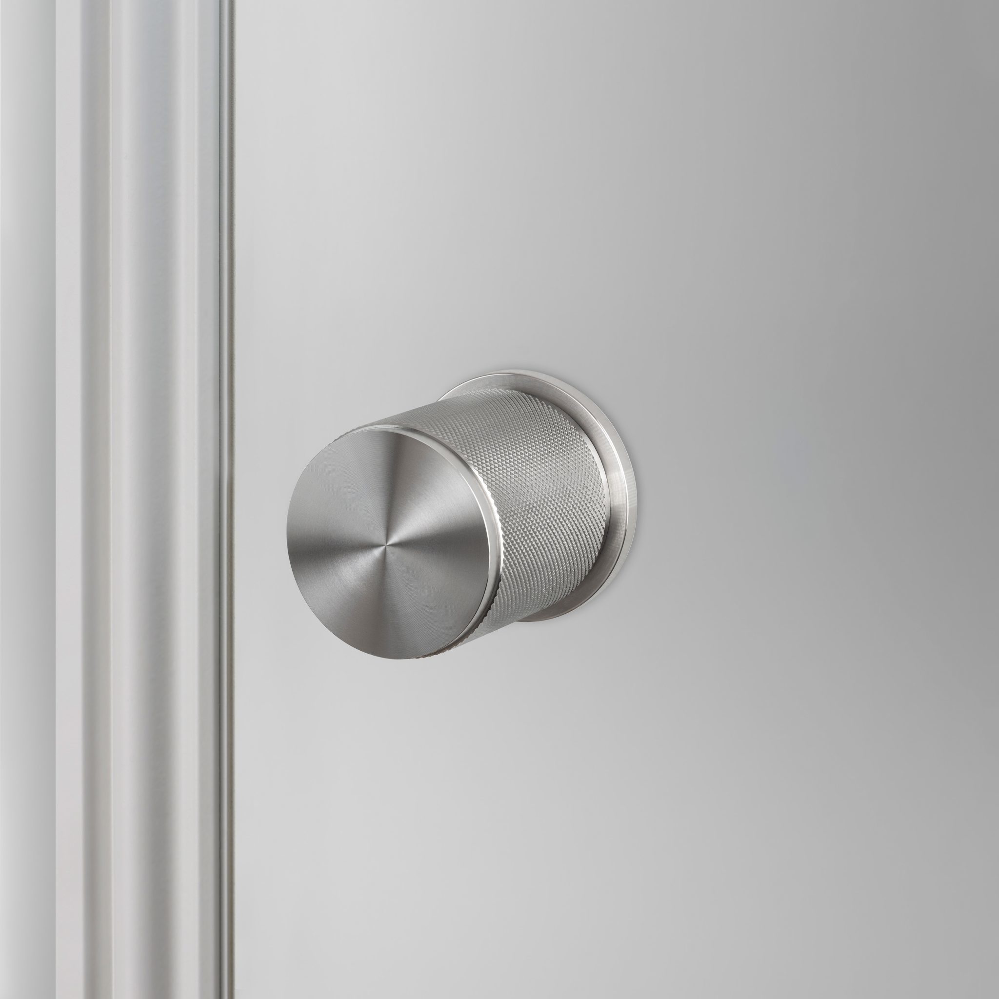 Beschrijving Paar draaibare massieve RVS deurknoppen met kruislings geslepen motief van Buster and Punch