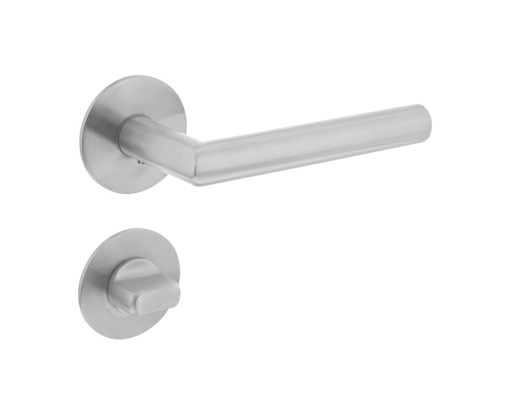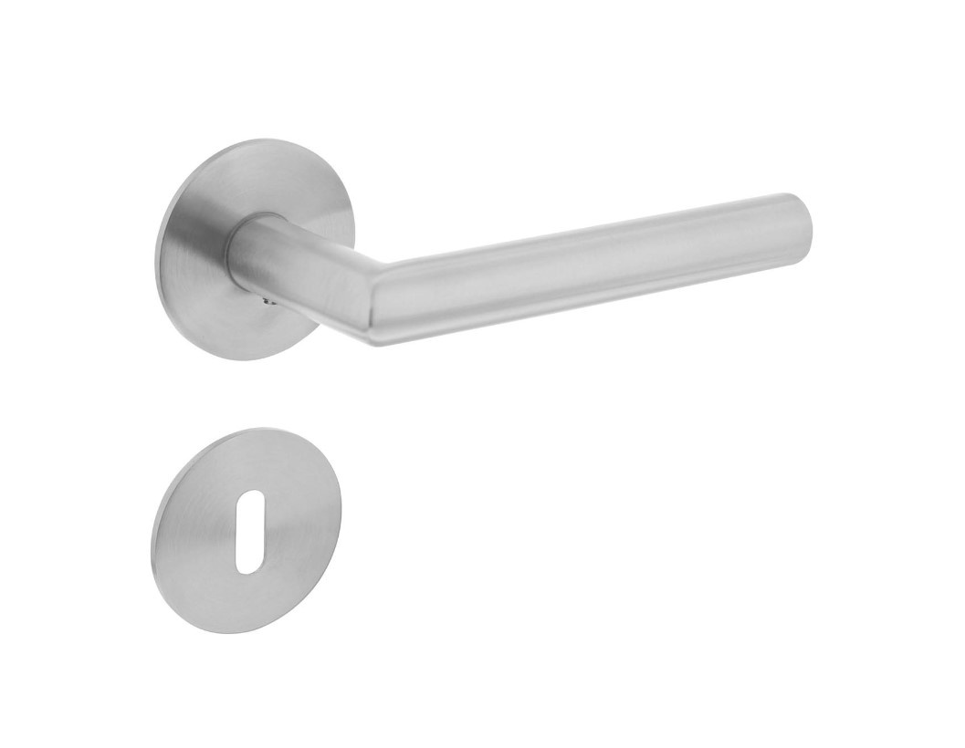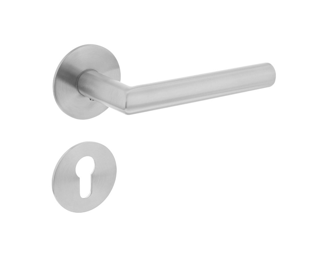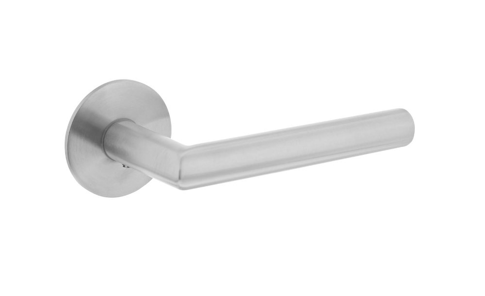 Deze deurkruk op rond rozet is uitgevoerd in roestvast staal en naderhand geborsteld, waardoor hij een matte uitstraling krijgt.