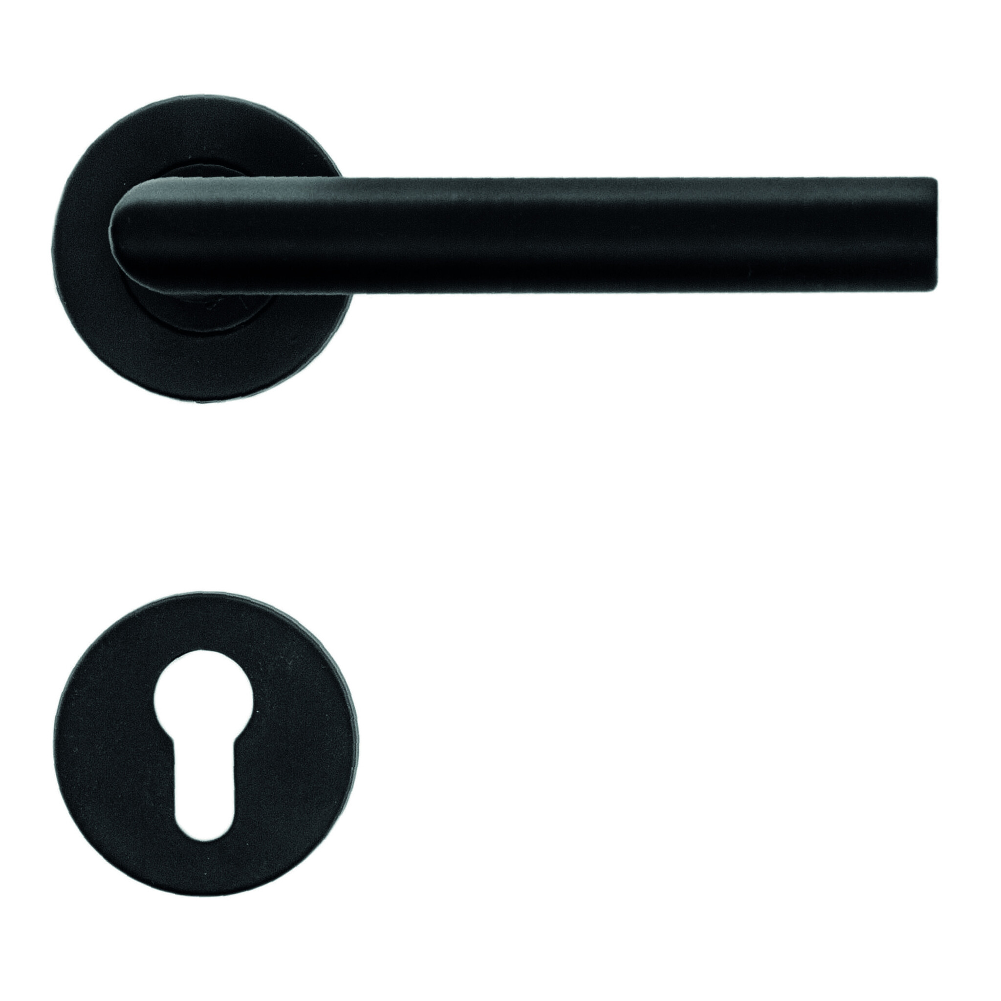 De deurklinken zijn voorzien van een mat zwarte poedercoating met gladde afwerking (RAL9005).
