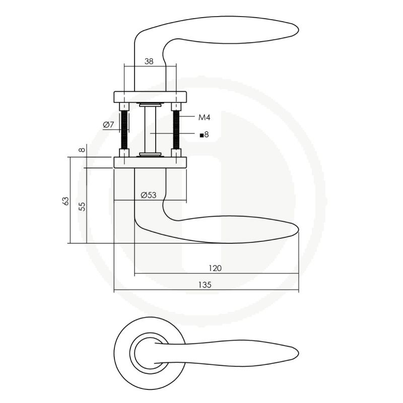 De deurkrukken staan op ronde schroefrozetten met een diameter van 53 mm en een dikte van 8mm . Om de deurklinken nog beter op hun plaats te houden zijn de rozetten voorzien van nokken. Doordat de rozetten d.m.v. schroefdraad gemonteerd kunnen worden zijn ze makkelijk demonteerbaar.