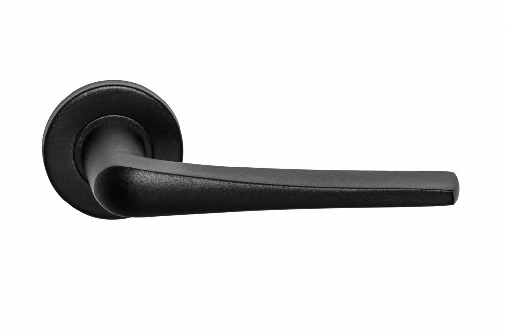 Beschrijving Zwarte deurklinken voorzien van een mat zwarte structuurlak