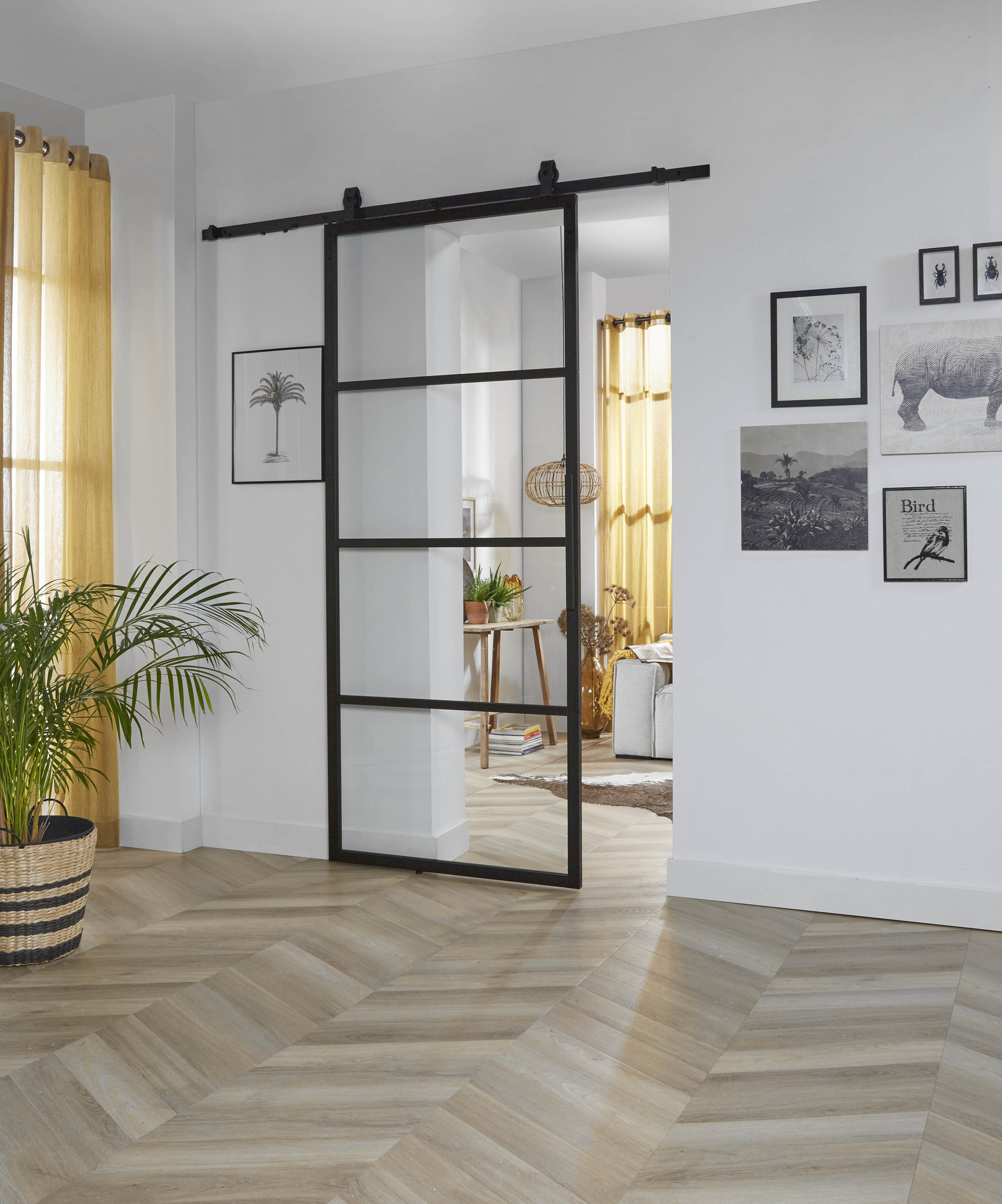 Beschrijving Zwarte schuifdeur 2150x980x28mm transparant glas + Basic TOP ophangsysteem dat van boven bevestigd wordt.